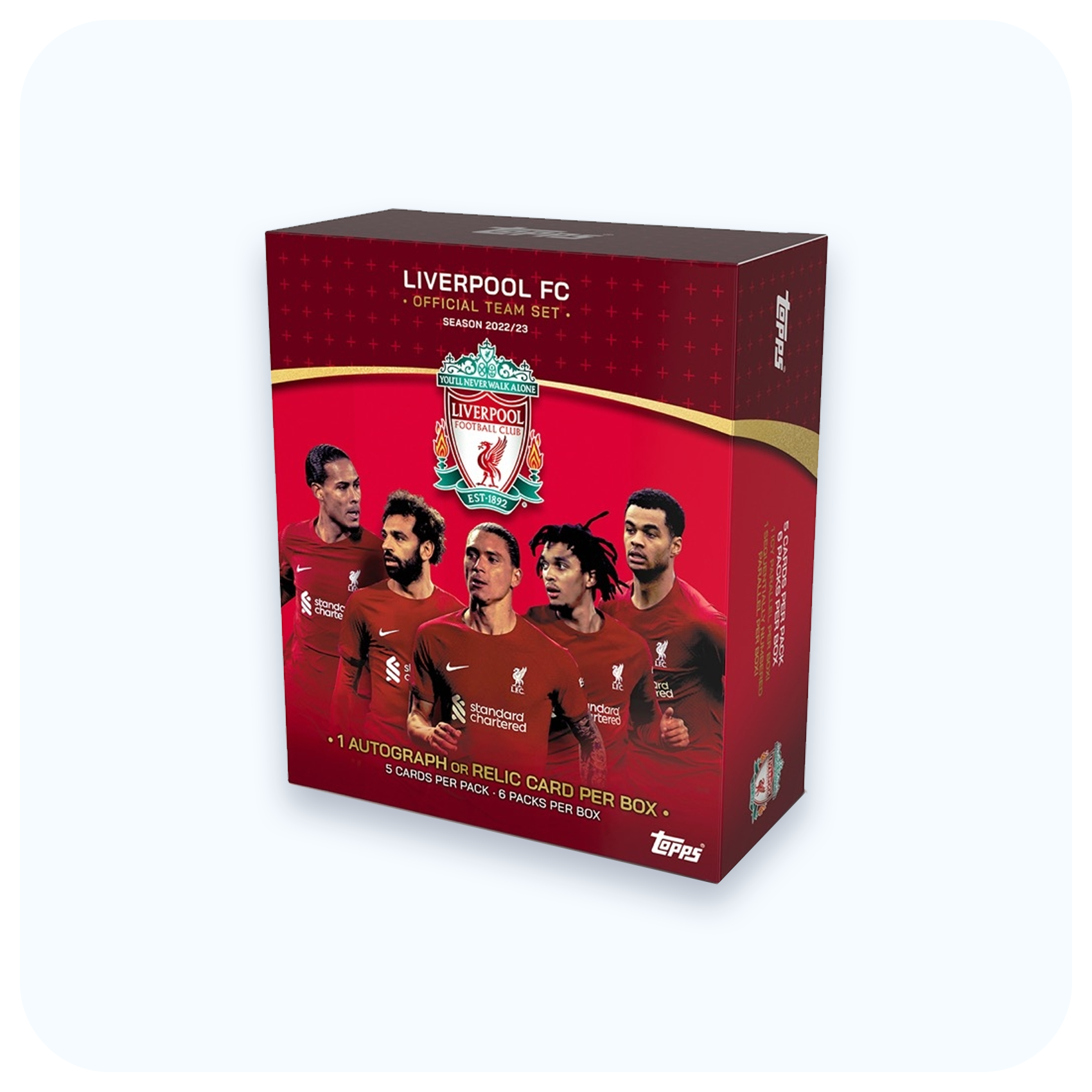 Kultowa klubowa kolekcja Topps dedykowana Liverpool Football Club wraca w odsłonie na sezon 2022/23, zachwycając świeżymi projektami i nowym spojrzeniem na klasyczne motywy związane z miastem oraz legendarnym „You'll Never Walk Alone”. W 50-kartowym base secie nie zabrakło również odświeżonych kart Our City oraz eleganckiej, wyjątkowej serii Gold Drip podkreślającej charakter i tradycję LFC.